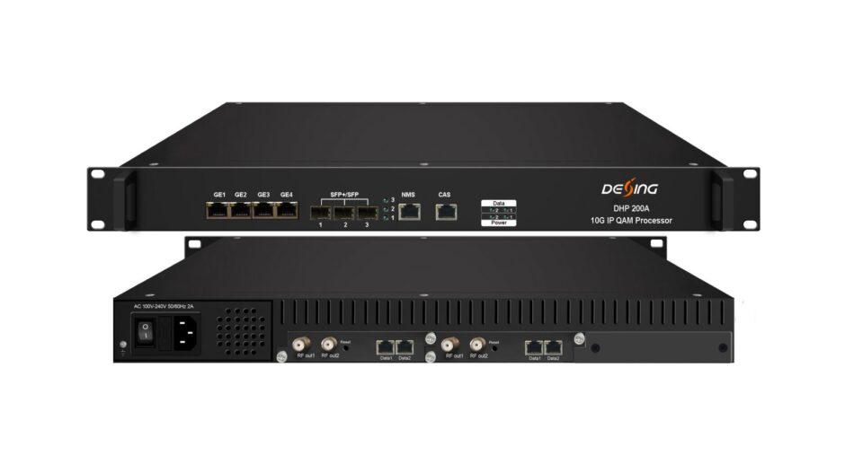 DHP200A 10G IP QAM processor is an all-in-one device developed by DEXIN. It integrates multiplex, scrambler and modulator in one body with 48 (or 96) DVB-C QAM channels output through 2 (or 4) RF ports. With 10G switch built in, it can process both 10G optical signal and normal gigabit electronic signal to work as traditional QAM modulator.