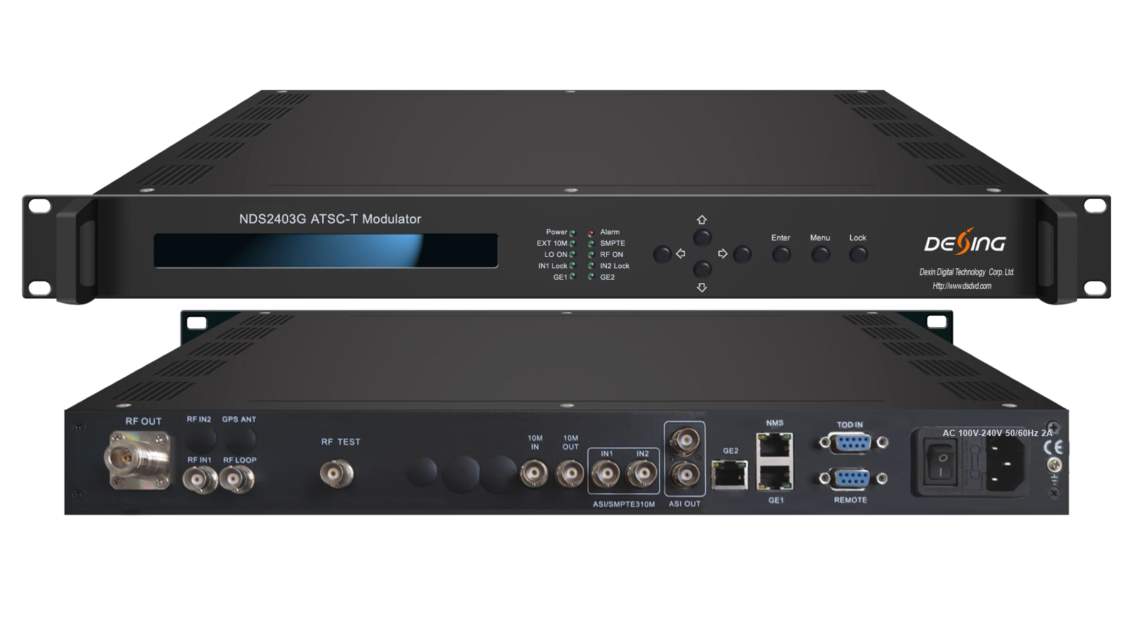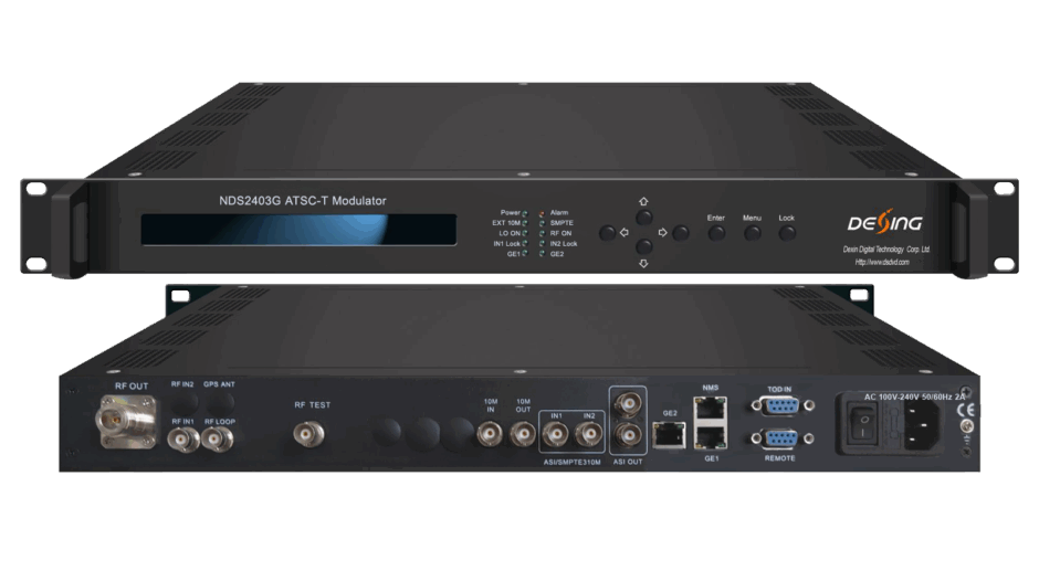 NDS2403G ATSC-T modulator is DEXIN’s newly designed product supporting DVB-ASI and SMPTE-310 input. After modulating the inputting signals through ATSC 8-VSB, it can output RF signals with the range between 50~860MHz. In other words, NDS2403G ATSC-T modulator supports the coding and modulating mode under ATSC-T A/53 standard. It also supports adaptive non-linear and linear digital pre-distortion (DPD). Additionally, the system of this device can be on line controlled and upgraded through network, which can be widely used in ATSC-T digital broadcasting network setup and the testing for ATSC-T set top box design.