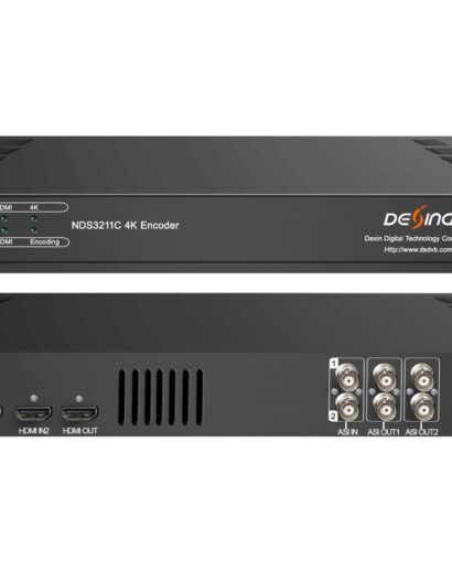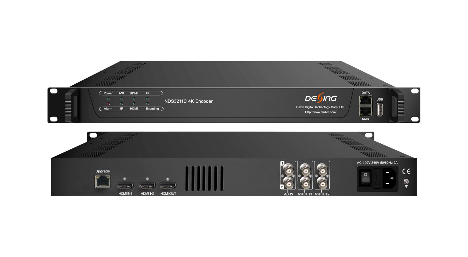 NDS3211C is a newest professional 4K Encoder designed by Dexin. It is equipped with two HDMI (2.0) channel UHD signal input (hot redundancy) supporting H.265/HEVC and H.264/AVC video encoding format and MPEG1 Layer 2, LC –AAC audio encoding and DD AC3 passthrough audio encoding. It can output 1 encoded TS through 4 ASI output ports and 4 MPTS output through GE output port.