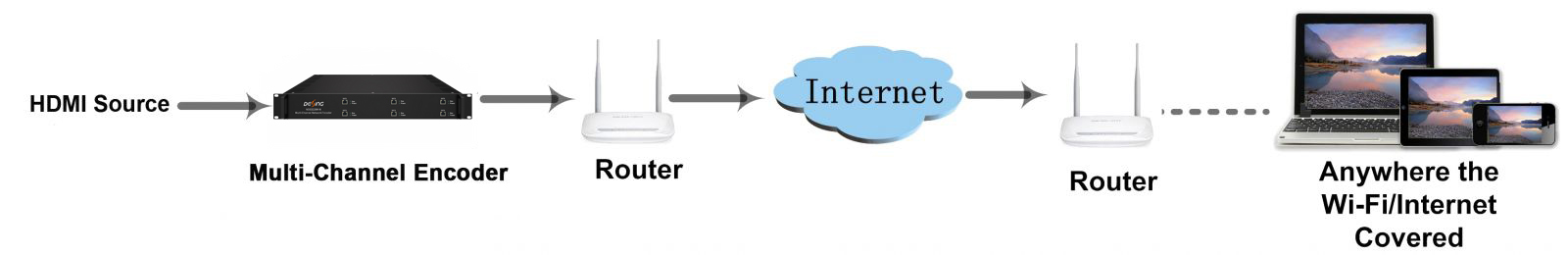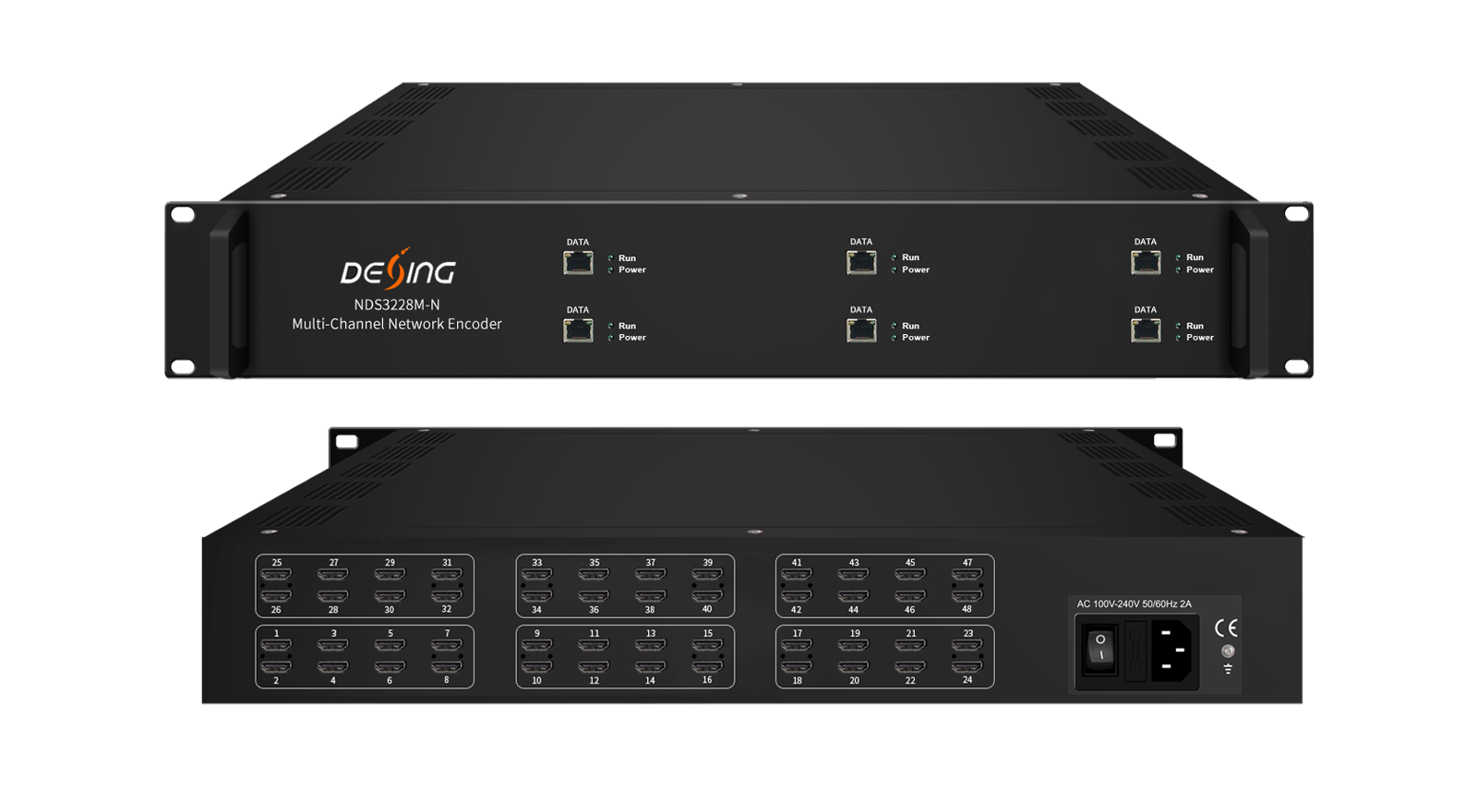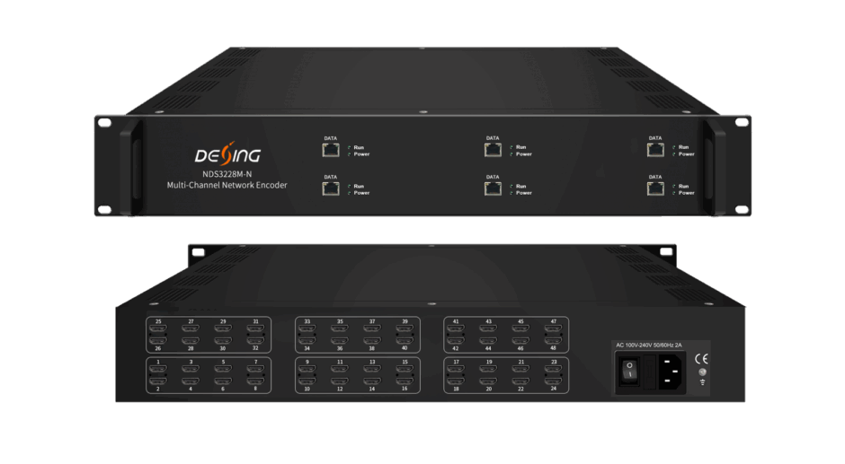 DEXIN NDS3228M-N 48-Channel Network Encoder is a 2-U encoding device for IP broadcasting. It is equipped with 48 HDMI-input channels with HEVC/H.265 and MPEG-4 AVC/H.264 video encoding and MPEG-1 Layer 2, LC-AAC, HE-AAC audio encoding and AC3 Pass through. It can transfer the live program through the internet/LAN and output IP streams over UDP (Unicast/Multicast), SRT, RTSP, RTMP, HTTP and HLS, and the output signals can be received by PC, phone and other mobile terminals. NDS3228M-N enables you to watch the programs via your IP STB, PC or TV anywhere.