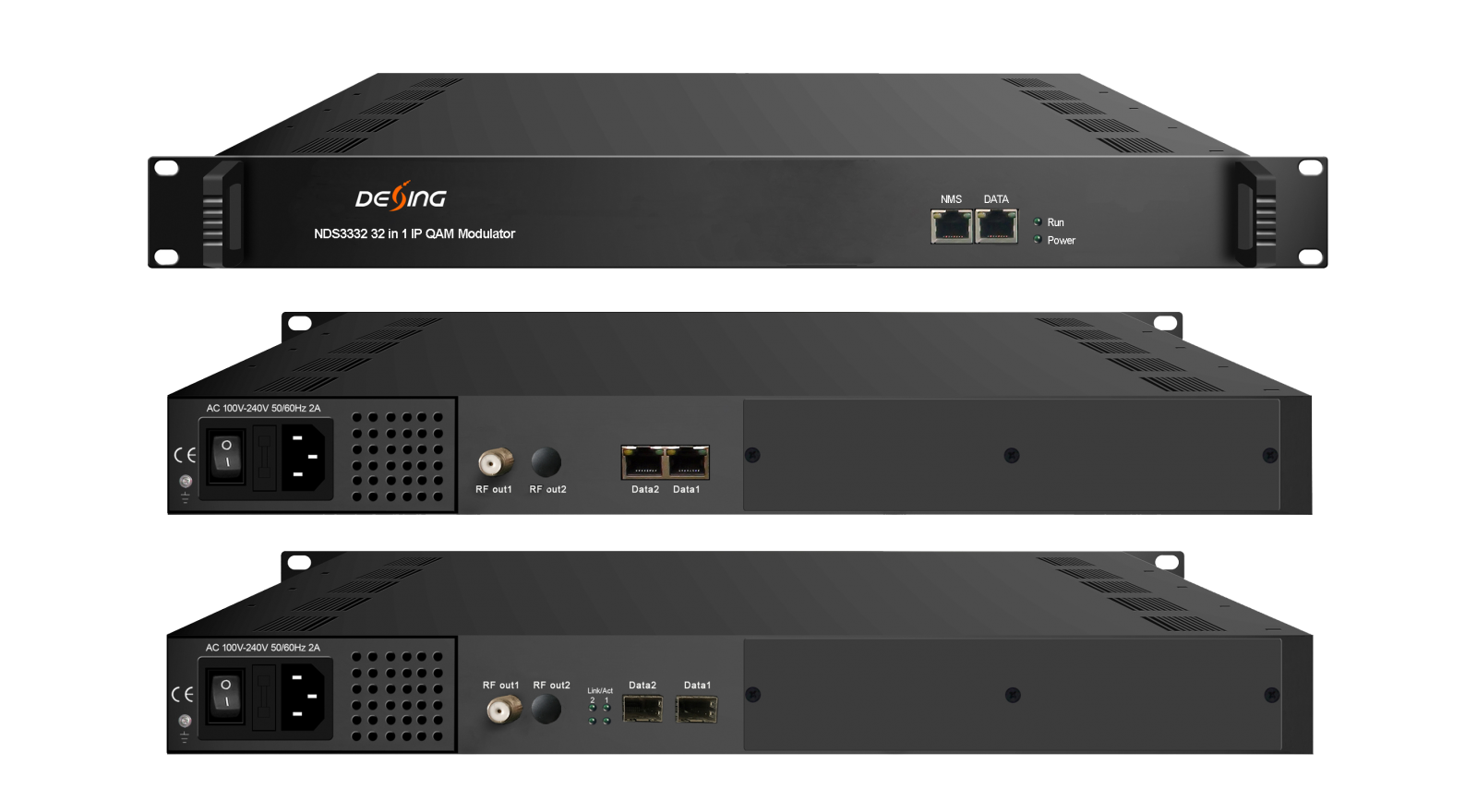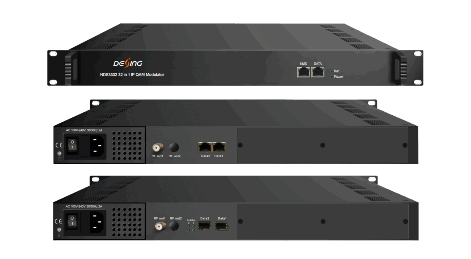 NDS3332 32 in 1 IP QAM Modulator is DEXIN’s Mux-scrambling-modulating all-in-one device. It supports maximum 1024 IP input through the 3 GE ports and 32 multiplexing scrambling QAM (DVB-C) modulating channels with non-adjacent carriers (50MHz~960MHz) output through the RF output interface. Its pay-as-you-grow modular design and flexible configuration are making it extremely scalable, very reliable with high performance, all of which are adaptable to newly generation CATV broadcasting system.