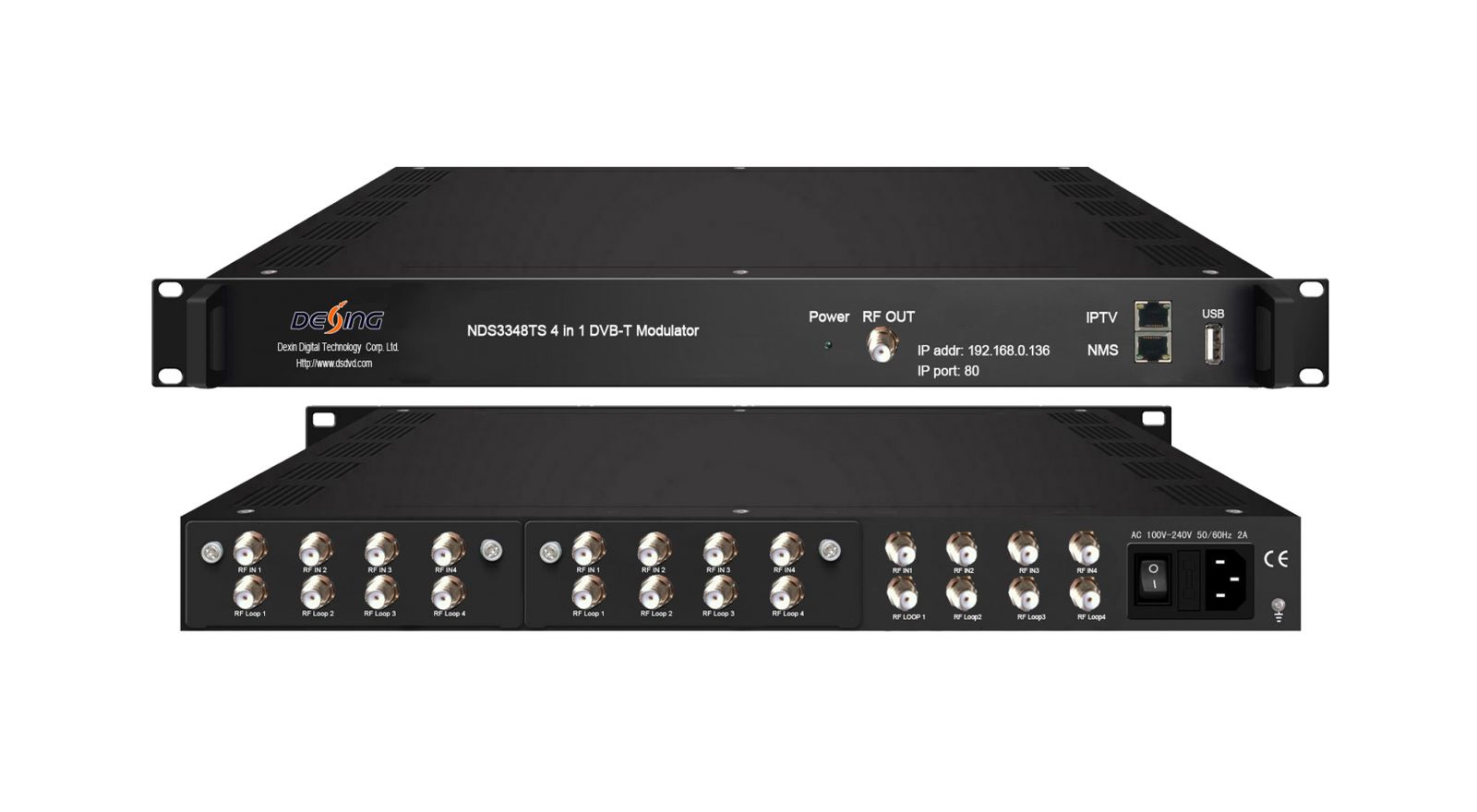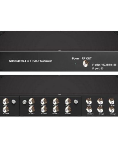 NDS3348TS (NDS3348CS) is a high performance and cost-effective DVB-T (DVB-C optional) modulator designed by Dexin. It supports DVB-S2 (DVB-(T) optional) tuner inputs, after multiplexing, scrambling (only for DVB-C) and modulating process, then it gives 4 RF output. To meet customers’ various requirements, this device is also equipped with 128 IP input and 4 MPTS output over UDP and RTP. Its pluggable structure design greatly facilitates the change of modules as needed. Moreover, NDS3348TS (NDS3348CS) can support Biss descrambling and can be upgraded and controlled through network system, which allows it to be widely used in setting up digital broadcasting network and provide good signals for scientific laboratory and DVB-T STB.