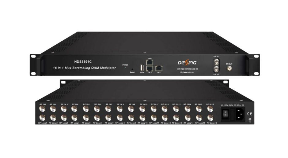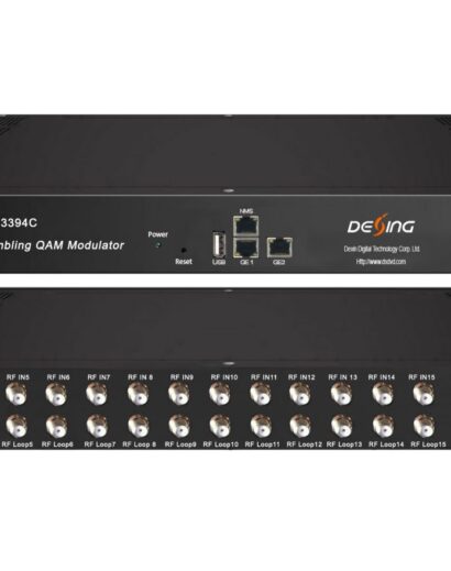 NDS3394C is a high performance and cost-effective QAM modulator designed by Dexin. It supports 16 DVB-C (DVB-T/-(T)/-S/-S2/S2X, ATSC, ISDB-T optional) FTA tuner input, maximum 512 IP input through GE1 and TS input for re-mux through 2 ASI ports. After multiplexing, scrambling and QAM modulating, it gives 16 non-adjacent carriers output and 1 IP (MPTS) output through GE1.