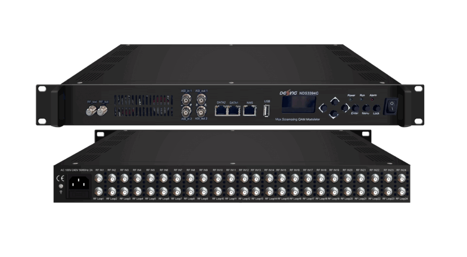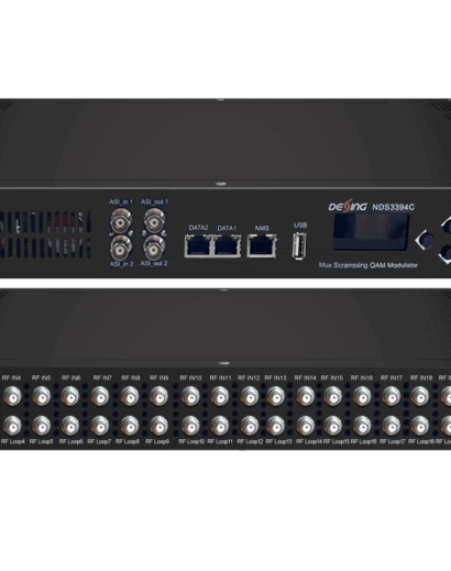 NDS3394C v3 is a high performance and cost-effective QAM modulator designed by Dexin. It supports 24 or 16 FTA DVB-S/S2/S2X or DVB-C/T/T2/ISDB-T multi-mode switchable tuner input, maximum 128 IP inputs through DATA1 and 2 TS inputs for re-mux through 2 ASI input ports. After demodulating, multiplexing and QAM modulating, it outputs 16 non-adjacent carriers and 16 IP (MPTS) through DATA2. Two kinds of software for order option, BISS descrambling version (without scrambler feature) or Scrambler version (wtihout BISS descrambling feature).