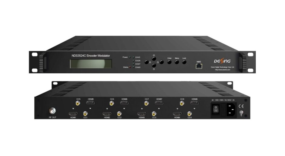NDS3524C encoder modulator is DEXIN’s all-in-one device integrating MPEG2 encoding and modulating to convert audio/video signals into DVB-C/T/ATSC/ISDB-T/DTMB RF out. It supports 1/4/8 HDMI inputs, and its pay-as-you-grow modular design and flexible configuration are making it extremely scalable, and very reliable with high performance. The signals source could be from STB, satellite receiver, closed-circuit television cameras and antenna etc. Its output signal is to be received by TVs or STBs etc.