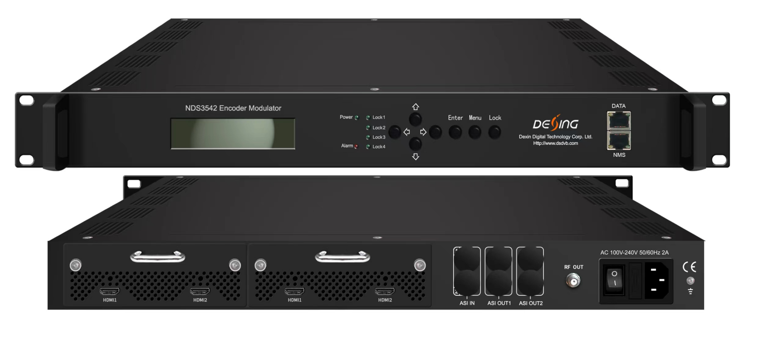 NDS3542 series products are DEXIN’s all-in-one devices which integrate encoding, multiplexing and modulation to convert V/A signals into digital RF output. It adopts inner drawer-type structural design which greatly facilitates the change of encoding modules (HDMI/CVBS/SDI/YPbPr/…) as needed. To meet customers’ various requirements, NDS3542 is also optionally equipped with 1 ASI input for re-mux and 2 ASI out ports. MPTS and SPTS output are available via the gigabit DATA port.