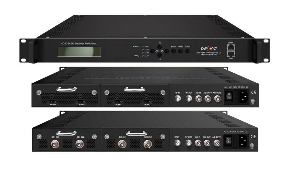NDS3542A series products are DEXIN’s new breakthrough all-in-one devices which integrate encoding (MPEG-2 HD/SD, MPEG-4/AVC H.264 HD/SD) and modulating to convert V/A signals into Digital RF output. It is equipped with 4 HDMI (4 SDI optional) channels input and 1 ASI input(optional) and output via 2 ASI ports(optional) and 1 DATA (4*SPTS or 2 or 4 MPTS–as per carrier numbers) output over UDP, RTP/RTSP. The latency has been greatly reduced to achieve an extremely low value from the encoding progress to the decoding terminals.