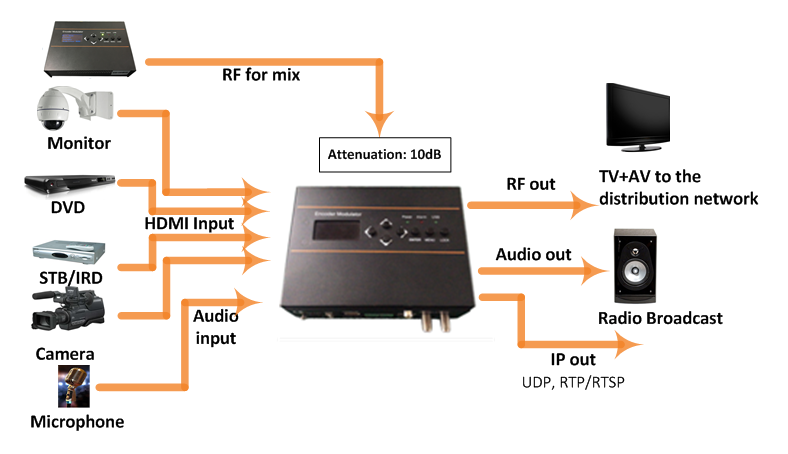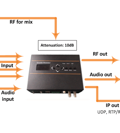 It is an all-in-one device integrating encoding and modulating to convert audio/video signals into DVB-C/DVB-T/ISDB-T/ATSC RF out.