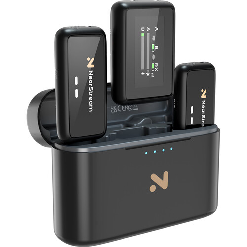 Content creators using a wide variety of devices will find the AWM20T 2-Person Wireless Microphone System from NearStream suits their audio recording needs. The system includes a camera-mount receiver with back clip and two clip-on transmitters with built-in microphones. USB-C, 3.5mm TRS, 3.5mm TRRS, and Lightning connectivity allows you to use the system with a wide variety of devices from camera to smartphones to laptops. Digital 2.4 GHz frequency transmission with adaptive frequency hopping delivers signals from up to 656′ away.